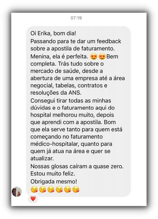 Tenho certeza que as informações e orientações didáticas e de fácil entendimento, constante nesse Manual – que vai para você acompanhado de vários BÔNUS GRATUITOS - vai esclarecer definitivamente todas as suas dúvidas sobre o RECURSO DE GLOSA, de forma objetiva, fácil e assertiva, para que você nunca mais tenha insegurança para faturar corretamente os itens, conferir os demonstrativos de pagamento x glosas, identificar e interpretar a glosa e para realizar o correto RECURSO DE GLOSA, para obter o crédito na conta da empresa.
